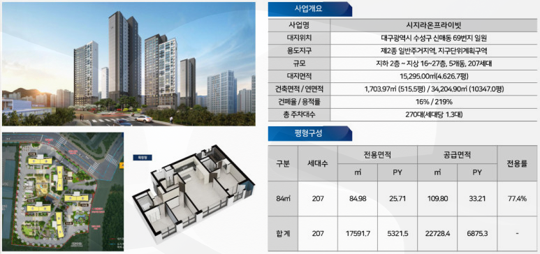 특히 전 세대가 전용 84㎡ 단일 평형(207세대)으로 공급되어, 실수요자들이 가장 선호하는 중형 면적대에 집중했다는 점이 눈에 띕니다. 건축면적 대비 용적률은 219%로 안정적인 밀도를 갖추고 있어 주거 쾌적성이 높을 것으로 기대됩니다.