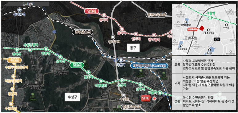 또한 중앙고속도로와 수성IC, 경부고속도로 진입이 용이해 자가용 이동도 편리합니다. 대구 전역뿐 아니라 인근 도시로의 광역 교통망까지 갖추고 있어 직장인이나 잦은 이동이 필요한 거주자들에게 적합한 입지입니다.